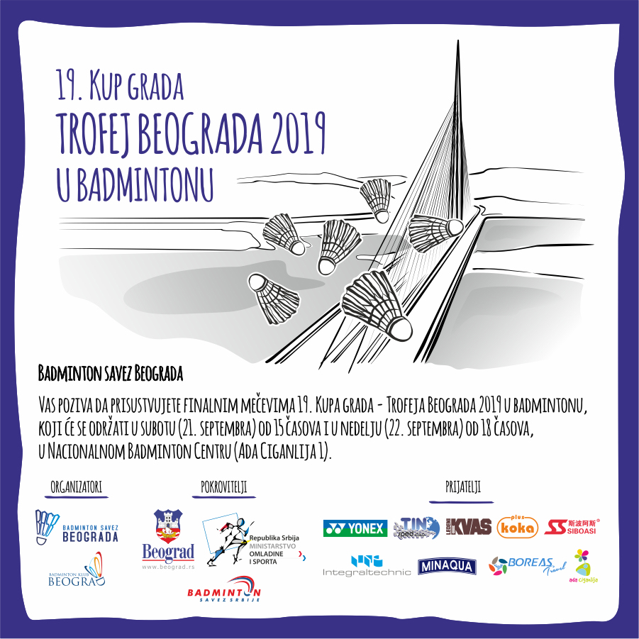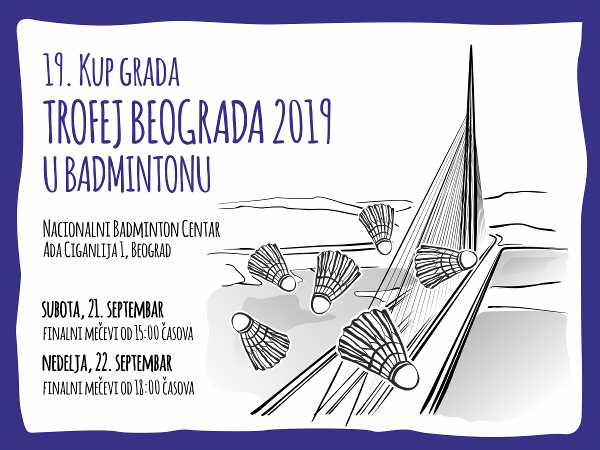 Posle gotovo tri i po meseca pauze i Prvenstva Srbije za seniore predstojećeg vikenda nastavljaju se bitke na domaćoj badminton sceni. U Nacionalnom badminton centru na Adi Ciganliji jedno od najprestižnijih nacionalnih takmičenja, Kup grada – Trofej Beograda 2019 u badmintonu, imaće svoje 19. izdanje. Na turniru, koji posle Prvenstva Srbije ima najdužu tradiciju od svih badminton događaja u našoj zemlji, za odličja 21. i 22. septembra 2019. boriće se preko 100 takmičara iz 11 klubova – BK Beograd, BK Clear (Beograd), BK Dinamo (Pančevo), BK Fanatik (Vršac), BK Helianthus (Novi Sad), BK Novi Sad, BK Pančevo, BK Ravens KG (Kragujevac), BK Zmajevi (Kruševac), BK Čačak i BK Ekstaza (Latković).