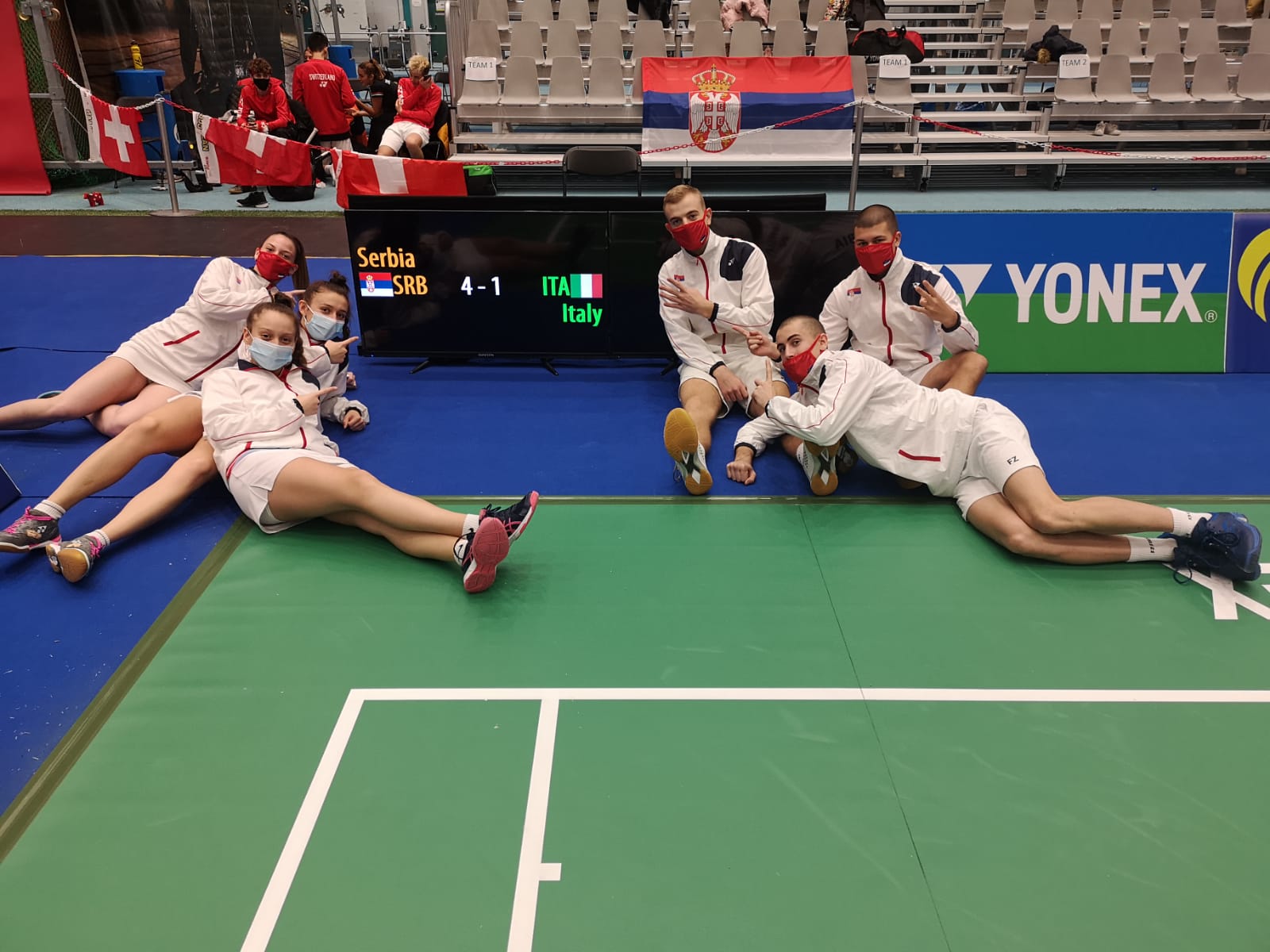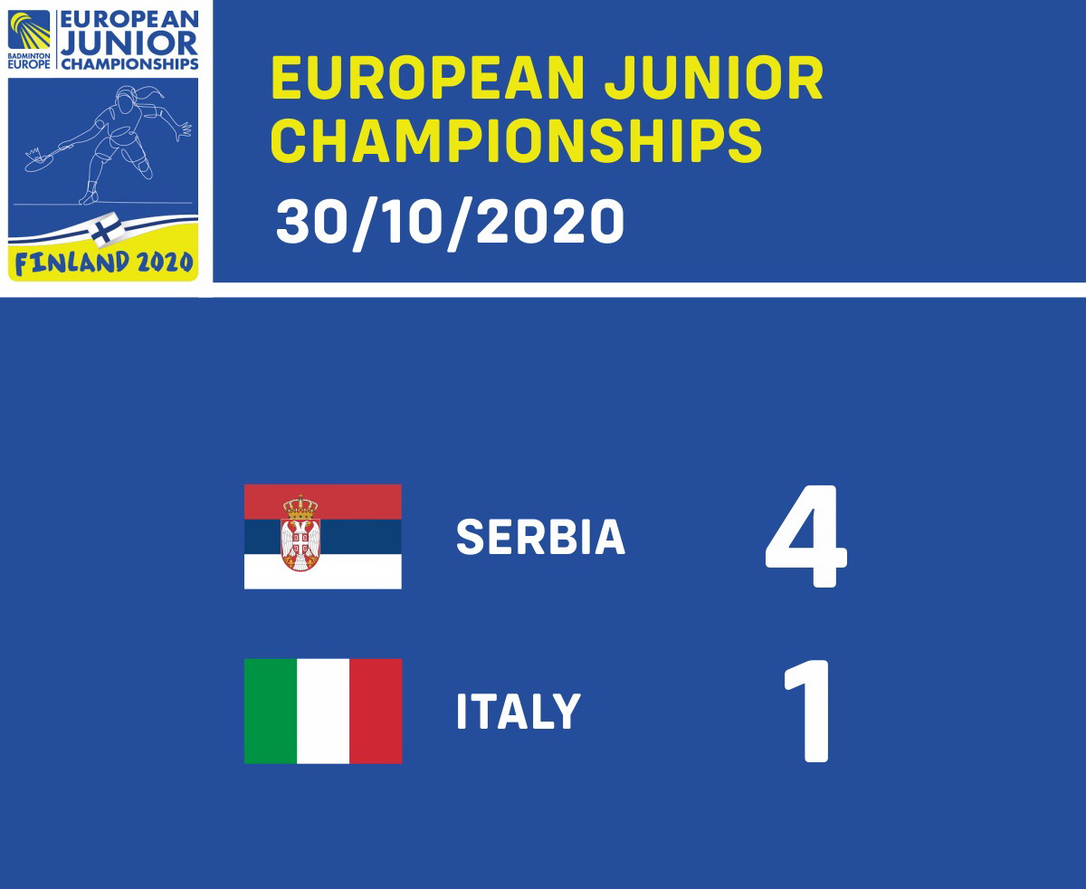 Prvi poen u duelu sa Italijanima našoj reprezentaciji je doneo mešoviti dubl Mihajlo Tomić, Anđela Vitman koji je bio superioran u duelu sa Mateom Masetijem i Jasmin Hamzom (21:13, 21:12). Prednost je duplirao Sergej Lukić koji je u muškom singlu, takođe ubedljivo, savladao Alesandra Gozinimasetija (21:7, 21:14). Sve dileme oko pobede otklonila je Marija Sudimac koja je u ženskom singlu očitala lekciju Katarini Fink (21:14, 21:15). U meču bez rezultatskog značaja na konačan ishod muški dubl, Ivan Kovačević, Mihajlo Tomić savladao je Matea Masetija i Luku Zhoua (21:11, 21:12), dok je u poslednjem okršaju ženski dubl Sara Lončar, Anđela Vitman izgubio od Katarine Fink i Jasmin Hamze (21:16, 21:17).