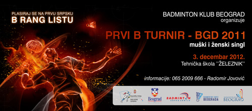 U organizaciji Badminton kluba Beograd, pod pokroviteljstvom Sekretarijata za sport i omladinu Skupštine grada Beograda, Ministarstva omladine i sporta Republike Srbije, uz podršku Badminton saveza Beograda i Srbije, u subotu 03. decembra u sportskim salama Tehničke škole u Železniku održaće se "PRVI B TURNIR – BGD 2011".
