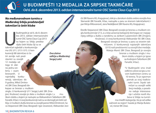 U nedelju, 16. marta 2014, svetlost dana je ugledao šesti broj Badminton revije koji objedinjuje sve ono što se dešavalo u našem sportu u poslednjem mesecu 2013. Šesti broj informatora Badminton saveza Srbije (BASS) ima 32 strane na kojima možete naći kompletne izveštaje svih događaja iz kalendara BASS iz pomenutog perioda, fotografije koje su obeležile događaje u 2013… Šesti broj Badminton revije možete preuzeti OVDE