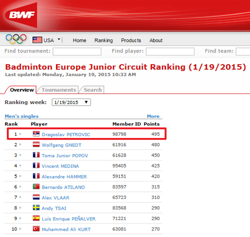 Dragoslav Petrović nastavio je da ispisuje nove stranice istorije srpskog badmintona. Naš najbolji junior izbio je na prvo mesto rang liste evropskog kruga koja je objavljena u sredu 19. januara 2015, što je najbolji plasman nekog srpskog igrača na ovoj listi. Zahvaljujući briljantnim rezultatima na turnirima Svetskog i Evropskog kupa Petrović je zaposeo na čelo sa 495 bodova, što je 15 više od drugoplasiranog na ovoj listi Austrijanca Volfganga Gnedta. Treće, četvrto i peto mesto drže Francuzi Toma Popov, Vinsent Medina i Aleksandre Hamer sa 450, 425 bodova, odnosno 420 bodova.