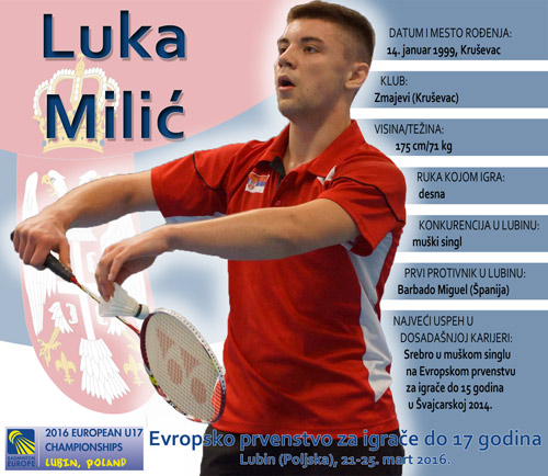 U ponedeljak, 21. marta 2016. u Lubinu u Poljskoj počinje Evropsko prvenstvo za igrače do 17 godina koje će okupiti preko 300 takmičara iz 37 zemalja. Boje Srbije na najjačem kontinentalnom takmičenju u ovom uzrastu braniće Luka Milić, evropski viceprvak sa šampionata Starog kontinenta za igrače do 15 godina u Švajcarskoj 2014. Naš daroviti badmintonac sa glavnim trenerom badminton reprezentacija Srbije Milanom Barbirom u subotu rano ujutru otputovao je u Poljsku. Pred odlazak za Lubin Milić je rekao da ga očekuje mnogo težak posao, ali da je maksimalno spreman i motivisan za sve izazove na Evropskom prvenstvu.