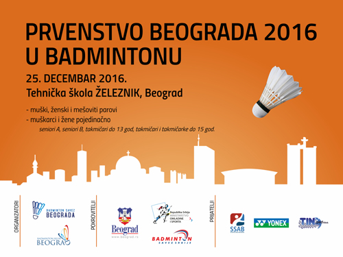 Obiman kalendar Badminton saveza Srbije došao je do svog poslednjeg događaja u 2016. U nedelju, 25. decebmbra 2016, u sali Tehničke škole u Železniku biće održano poslednje zvanično takmičenje u ovoj godini – Prvenstvo Beograda 2016 u badmintonu koje organizuju Badminton klub Beograd i Badminton savez Beograda, pod pokroviteljstvom Sekretarijata za sport i omladinu grada Beograda, Ministarstva omladine i sporta Republike Srbije i Badminton savez Srbije, a uz podršku prijatelja ovog takmičenja Sportskog saveza Beograda i kompanija “Tin šped” i “Yonex”. Takmičenje počinje u 10,15 č, a za medalje će se boriti muški, ženski i mešoviti parovi (seniori A), muški parovi (seniori B), muškarci i žene pojedinačno (seniori A, seniori B, takmičari do 13 godina, takmičari i takmičarke do 15 godina).